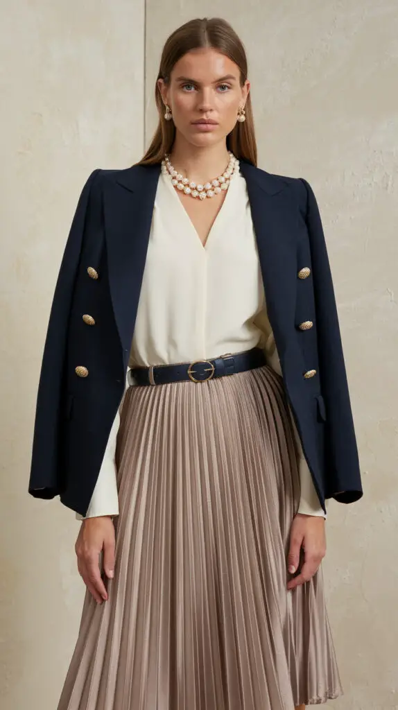 • Stick to classic, well-fitted pieces—white blouses, beige trousers, and structured bags.