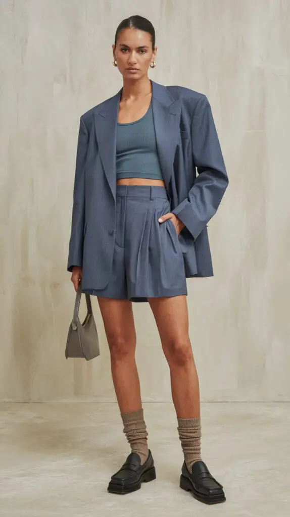 • A structured blazer over a fitted tank and pleated shorts for a smart-casual brunch outfit.