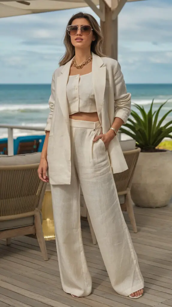 Imagine neutral-toned outfits that exude class—structured blazers over bralettes, tailored trousers with minimalist sandals, and monochrome layering that makes every outfit look instantly elevated. This look is perfect for city outings, evening dinners, or even professional settings.