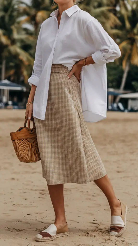 • Elevate your beachside ensemble with a silk scarf, minimalist gold jewelry, and stylish espadrilles
