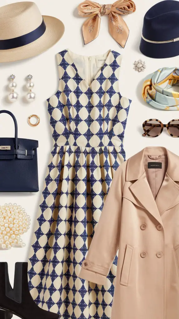 • Stick to timeless accessories: pearl earrings, silk scarves, and classic sunglasses.