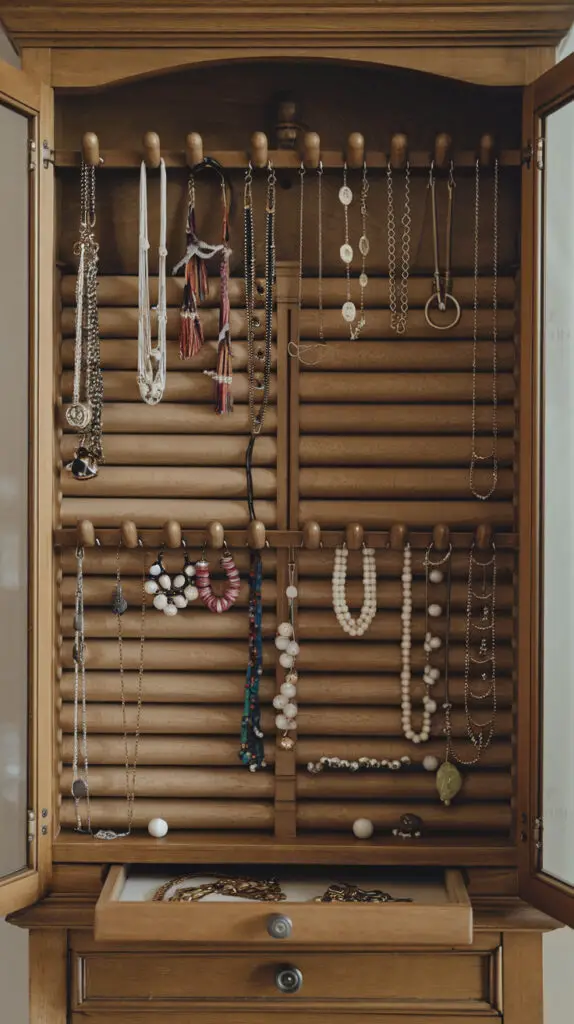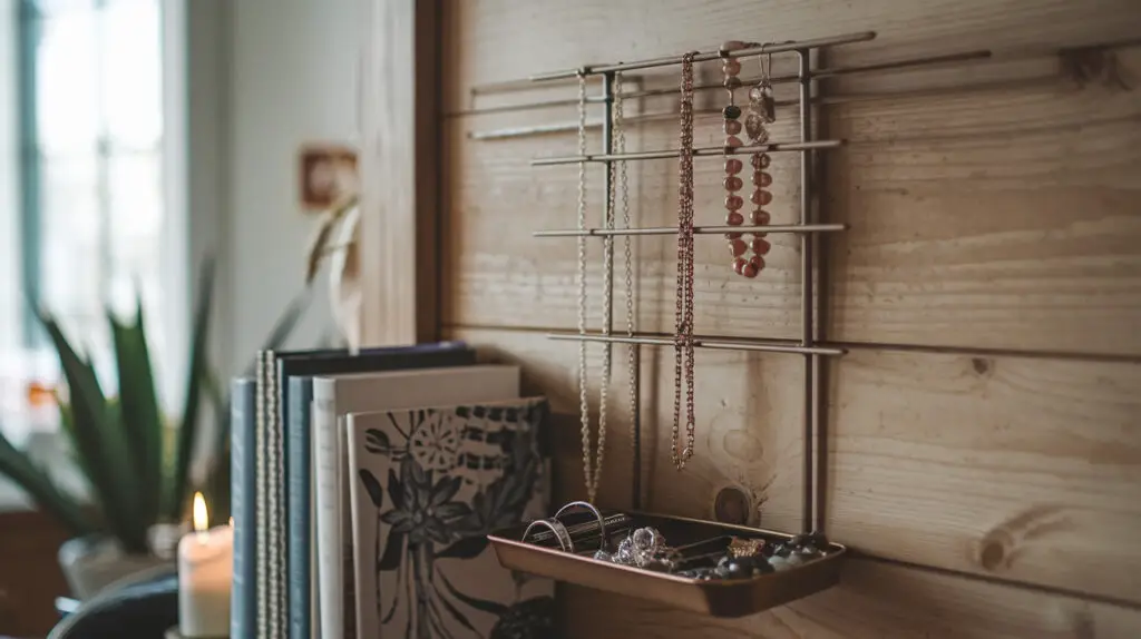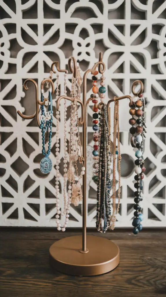 If you’re short on surface space but still want to display your jewelry beautifully, a wall-mounted jewelry organizer is a game-changer. Instead of letting your accessories get lost in a drawer, why not turn them into a functional piece of wall art?