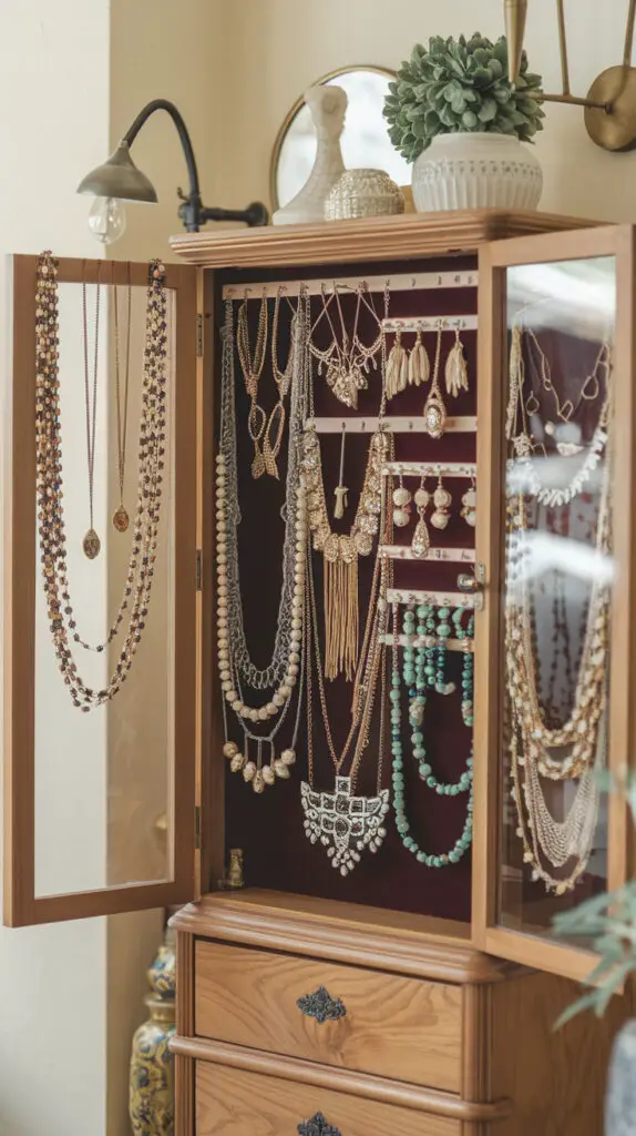 If you love the idea of a dedicated space for your jewelry but don’t want everything out in the open, a jewelry cabinet is the perfect solution. Unlike traditional storage boxes, a standing or wall-mounted jewelry cabinet feels like a secret vault for your treasures—open the door, and suddenly, your collection is elegantly organized, with every necklace hanging in its place and every ring nestled securely in a velvet-lined drawer.