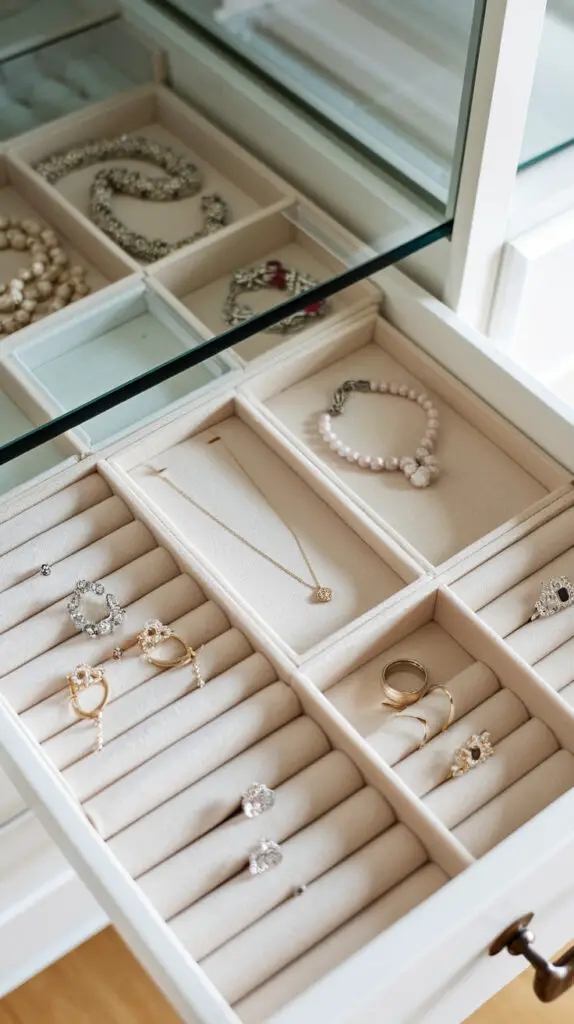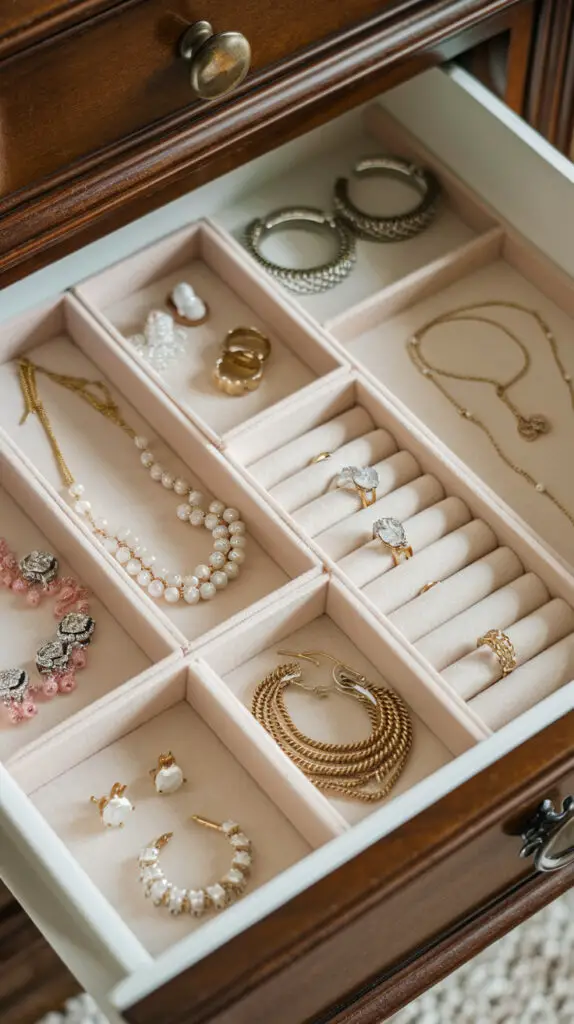 Let’s talk about the underrated brilliance of a well-organized jewelry drawer. If you’re the type who prefers a clutter-free space but still wants easy access to your pieces, this is a game-changer. Instead of tossing everything into a regular drawer, invest in soft-lined compartments or velvet jewelry inserts that turn an ordinary drawer into a stunning display.