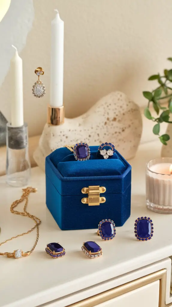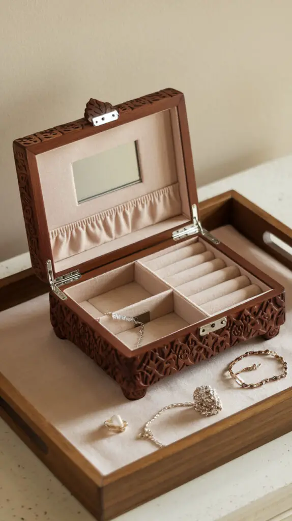 Invest in soft velvet ring boxes, linen pouches, or wooden cases to store your favorite pieces. These small but thoughtful details not only protect your jewelry from dust and scratches but also add a touch of sophistication to your space. Imagine opening a gorgeous wooden box lined with soft fabric every time you reach for your favorite pair of earrings—it’s a small luxury that elevates your everyday routine.