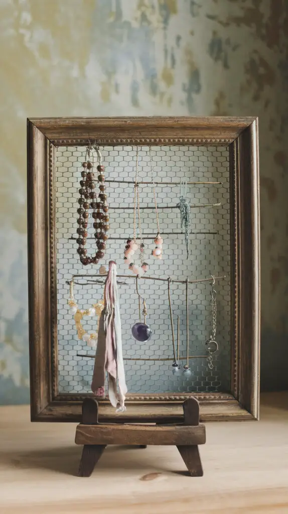A corkboard wrapped in luxe fabric can become an elegant earring display, while a vintage picture frame with chicken wire makes a stunning backdrop for hanging jewelry. If you want something truly one-of-a-kind, consider making a jewelry stand from repurposed materials—think driftwood, metal rods, or repainted ceramic dishes.