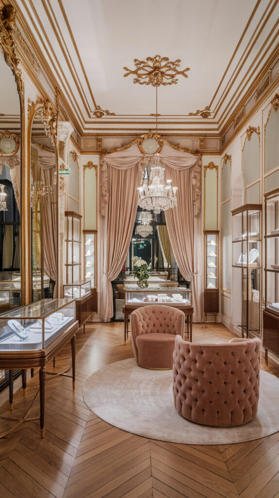 For those aiming for a timeless and romantic aesthetic, a Parisian-inspired boutique combines vintage charm with high-end luxury. Ornate moldings, gold-accented mirrors, and soft pastel walls create an environment reminiscent of an upscale couture salon.