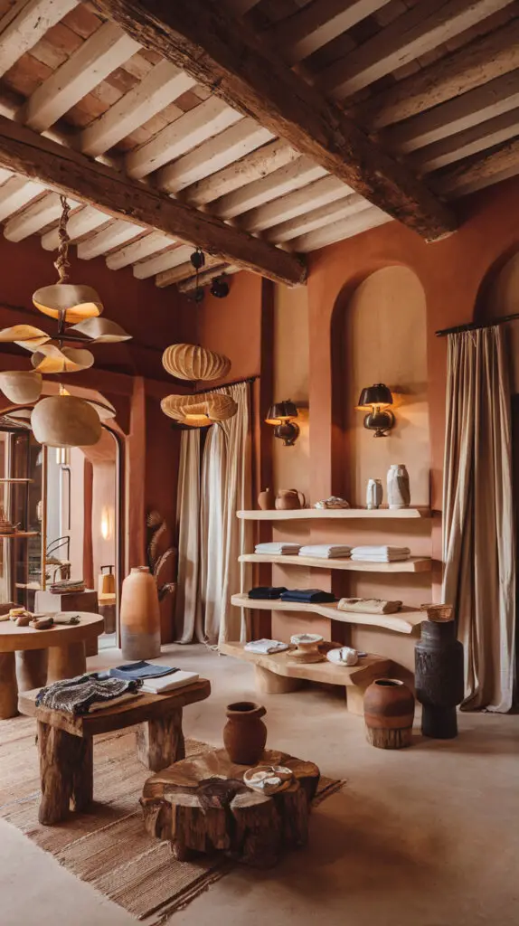 Reclaimed wood shelves, rough-hewn display tables, and handwoven textiles bring warmth to the space, while high-end lighting fixtures—such as sculptural chandeliers or antique brass sconces—add sophistication. Exposed wooden beams in the ceiling contribute to a cozy, heritage feel, making the boutique feel timeless.