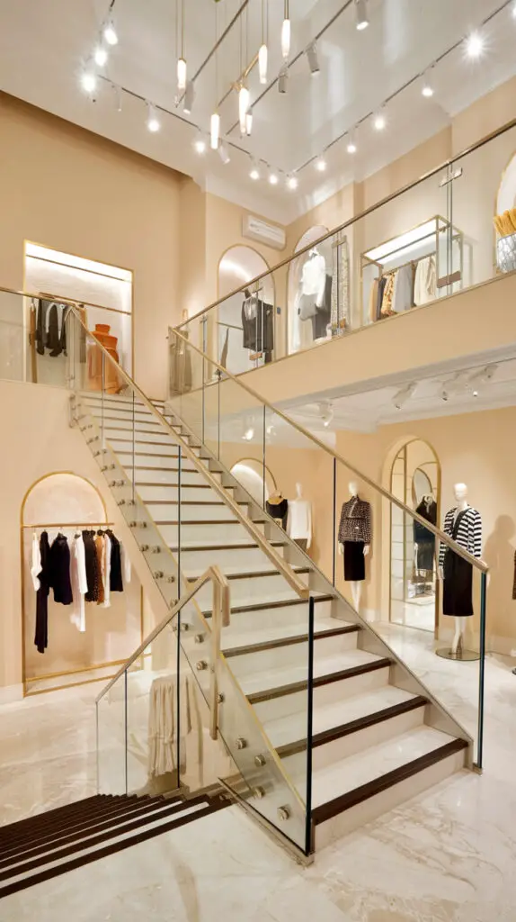 The key to designing a two-story store is ensuring seamless flow between levels. A glass-paneled or wrought iron staircase makes a stunning centerpiece, while an open atrium with a grand chandelier can instantly elevate the boutique’s elegance. Use the upper level for exclusive collections, personal styling services, or a cozy café-style seating area where shoppers can relax and enjoy the ambiance.