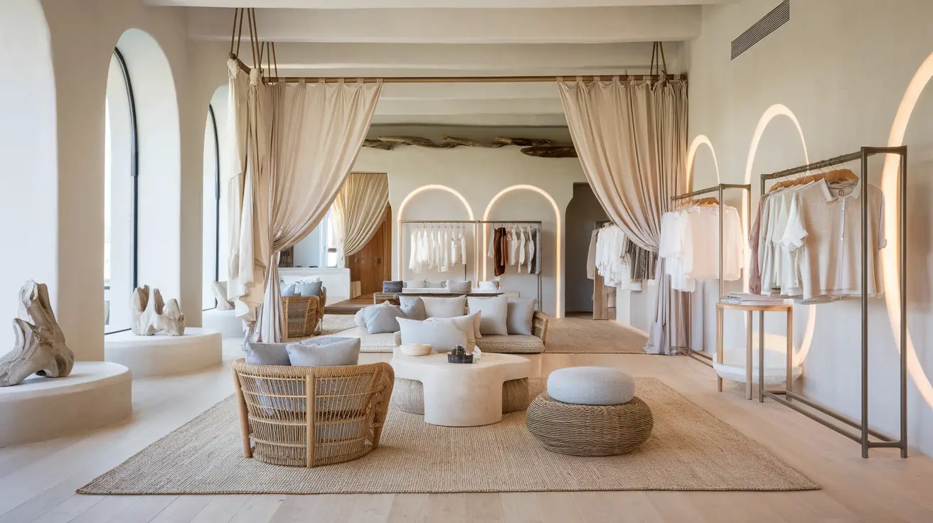 For a breezy and elegant take on luxury, a coastal-inspired boutique blends soft, natural textures with a clean, modern aesthetic. This style is perfect for resort wear, high-end casual fashion, or boutiques located in beachside or tropical destinations.