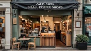 Opt for sleek counters, glass display cases, and geometric decor. LED lighting under shelves and around counters enhances the minimalist vibe. Keep seating simple with streamlined chairs and tables in muted tones.