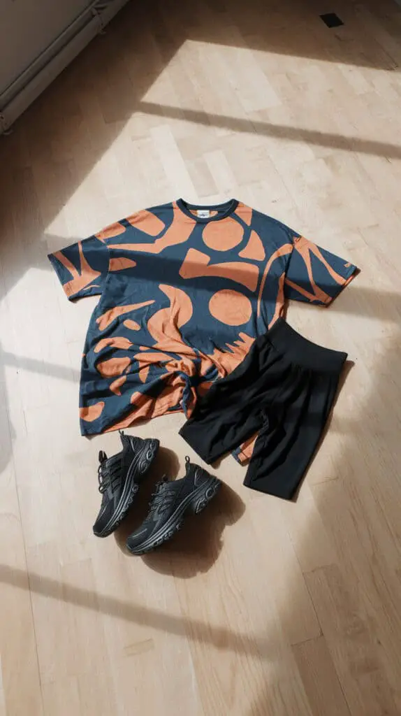 This one’s a forever favorite. A loose oversized tee (borrowed from your brother or thrifted on purpose) paired with snug biker shorts gives that perfect balance of slouchy and sculpted. Add a pair of chunky sneakers and you’re good to go.