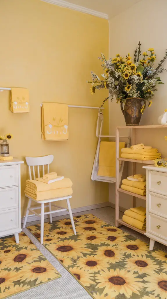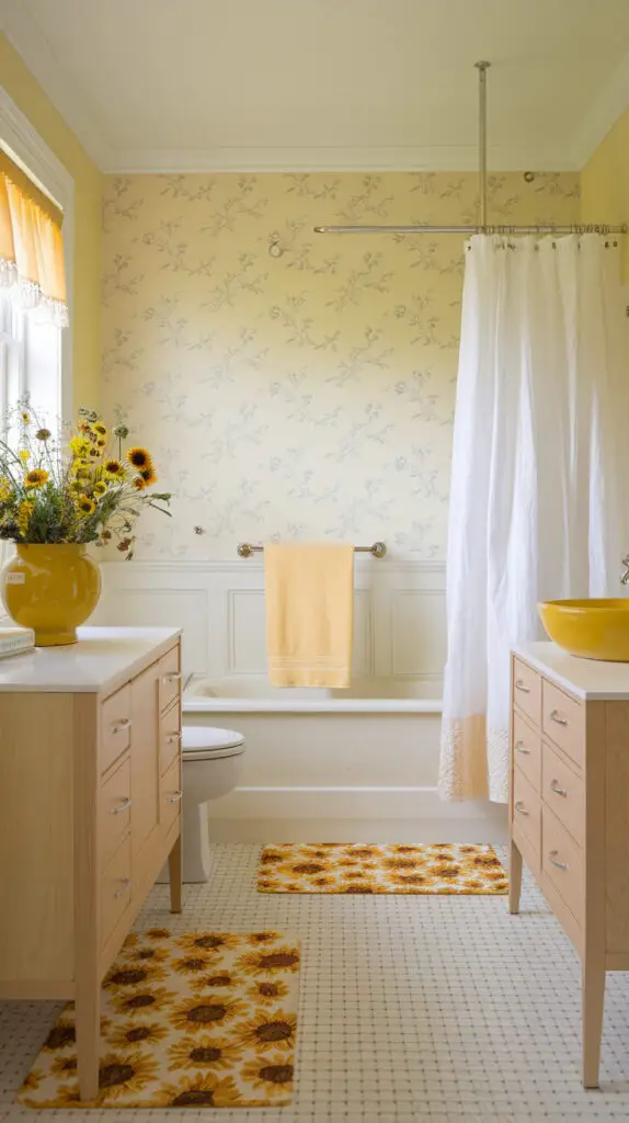 Even if you’re renting, don’t panic—removable wallpaper in a yellow gingham or delicate floral print can give the same effect without risking your deposit. And don’t forget your accessories: yellow towels, a little sunflower-printed mat, or even just a vintage vase filled with faux (or real!) wildflowers can make a big impact.