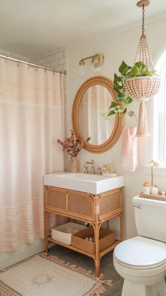 Start with a pale blush or dusty peach color scheme and layer in accents like a patterned pastel shower curtain, fringe-edged towels, and an oval mirror with rattan or cane framing. Add texture everywhere: cotton, linen, seagrass, and even glass.