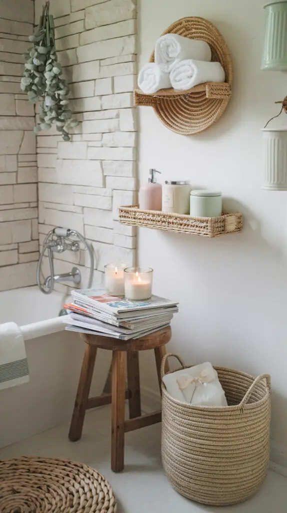 Cottagecore thrives on texture—especially when it comes from nature. Woven baskets, wood shelving, and stone accents all help bring that grounded, countryside charm into a bathroom. I love using a light wooden stool next to the tub (even if I mostly use it to stack unread magazines and half-burned candles).