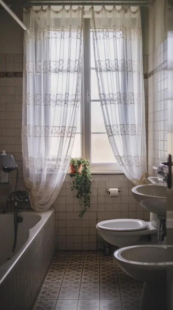 Harsh blinds are the enemy of soft aesthetics. If your bathroom has a window (lucky you!), swapping out whatever’s there for a pair of sheer, lacy curtains will completely change the feel of the space. Think of the kind your grandma might have had—only cleaner and Instagram-ready.
