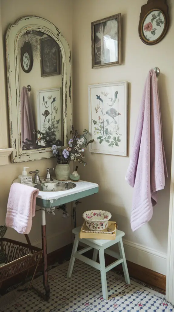 The cottagecore aesthetic bathroom isn’t about perfection—it’s about personality. One of the most freeing things I ever did was lean into mismatched decor in my own bathroom. Think antique brass towel hooks, a rickety old mirror with chipped paint, and a tiny pink stool that looks like it came from a fairy’s powder room. Somehow, it all just works.