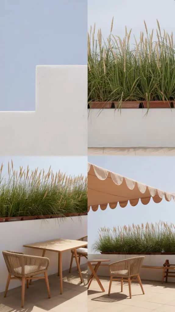 This one’s straight out of a Mediterranean daydream. Imagine a white gravel floor underfoot, clusters of olive trees in square planters, and lightweight wicker chairs paired with simple white bistro tables. You don’t need a lot of space for this layout—just enough for three or four seating zones that look intentional but not too staged.