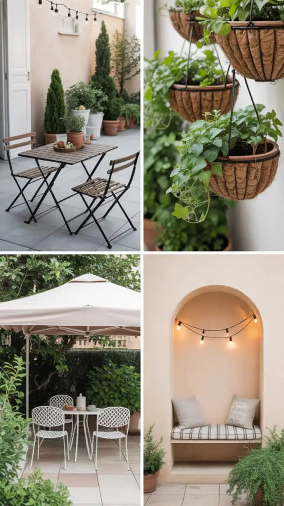 Perfect for smaller footprints or narrow outdoor rooms, this setup relies on fold-down furniture and vertical interest. Go for a minimal color palette—soft greys, white metal, unfinished wood—and let the plants do the talking. Hanging baskets with trailing herbs or flowers, small shelves with succulents, maybe a single trellis wall with trailing vines.