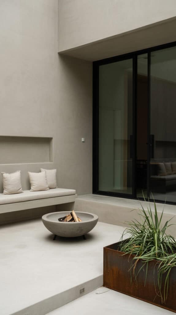 If you want something sleek but not cold, try polished concrete floors with custom built-in benches along two sides of the courtyard. Use cushions in soft earth tones or linen blends, and keep tables low and wide—more lounge than lunch. Accent with planters made of corten steel or natural stone.