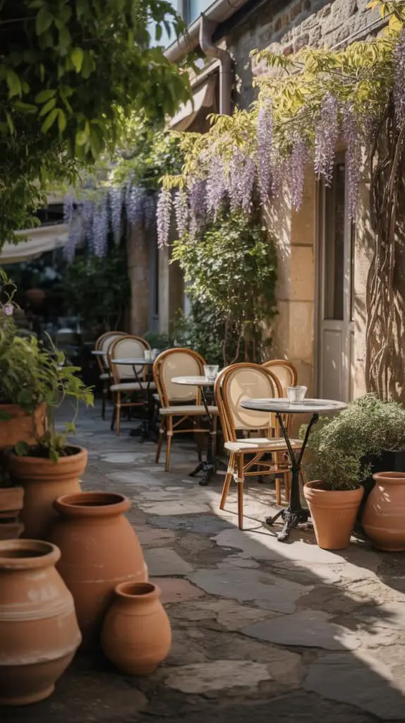 This one’s warm and romantic. Think terracotta pots everywhere—large, weathered, maybe a little cracked. Fill them with lavender, citrus, rosemary, or trailing blooms. Use natural linen tablecloths and wooden café chairs that don’t match too perfectly.