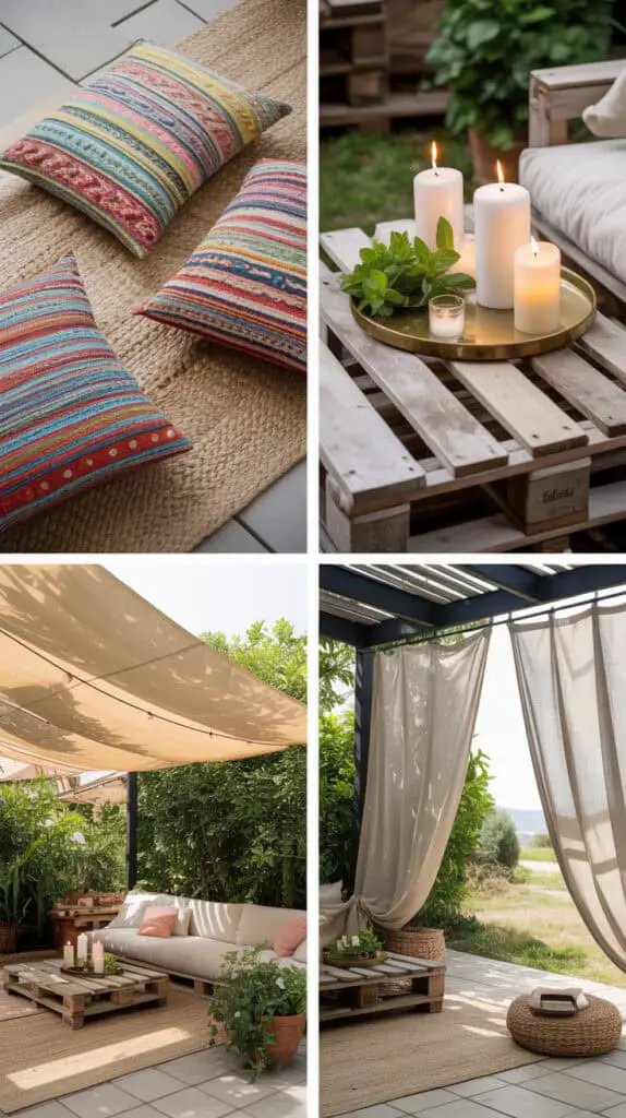 This one’s a little playful and a little dreamy—best for chill afternoons and late summer evenings. Use low pallet-style tables (painted white or sanded down natural wood), and scatter floor cushions or small poufs around them. Mix prints and textures: woven mats, embroidered throws, and linen runners.