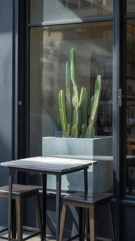 This design leans edgier but still feels welcoming. Go with raw or painted concrete floors, black or charcoal café furniture, and clean lines. Plant choices here matter—opt for large cacti, succulents, or olive trees in angular pots. They hold their own without fuss.