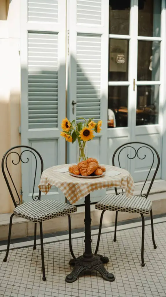 Picture a sunny square tucked between cream-colored walls, with black-and-white tiled floors and round café tables topped with pale flowers. Use traditional bistro chairs (woven or metal) and lean into the romantic charm with arched windows or soft shutters.