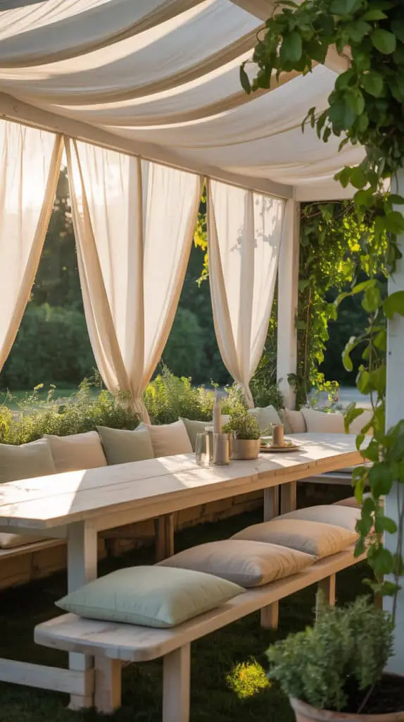 Use soft textiles, a few pendant lights, and long bench-style seating to stretch the space. It feels private and welcoming—ideal for long brunches or slower dinners. Surround it with planter boxes or an herb wall for a subtle, cozy garden café vibe.