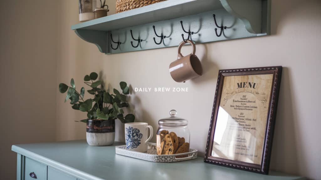 Use one small floating shelf above for style — a stack of coffee books, a glass jar of biscotti (even if it’s empty), or a framed menu print. Add one piece of art or vintage signage to anchor it visually. If it’s the first thing you see when you walk in, all the better — now the house welcomes you with coffee.