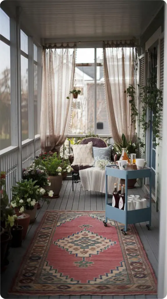 Add a rug that can handle some wear and a little music speaker, and you’ll never want to go back inside. Curtains or roll-down bamboo shades add softness, and in cooler months, a plug-in faux fireplace or even a hot water bottle under the table can keep things snug.