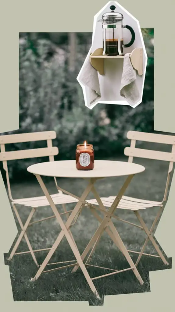 If you live in an apartment or townhouse with a tiny balcony, this one’s for you. Go for a round bistro table, two slim café chairs (foldable ones save space), and either a rolling bar cart or wall-mounted fold-out shelf for your coffee tools.