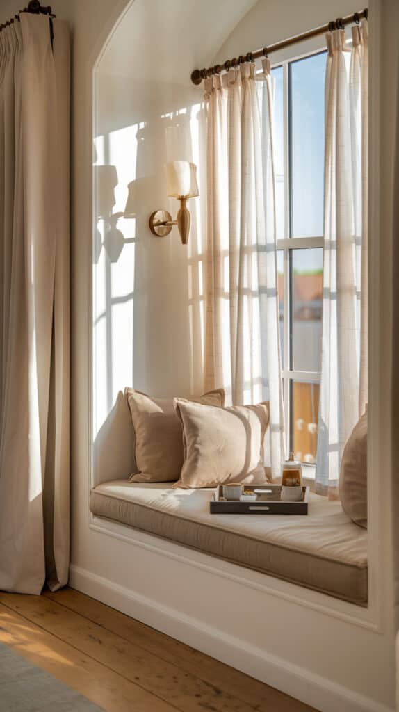 Frame the window with sheer curtains or even café-style café curtains (halfway up) for that bistro effect. The view doesn’t need to be grand — just the act of sitting there, light coming in, hands wrapped around a warm cup… it’s everything.