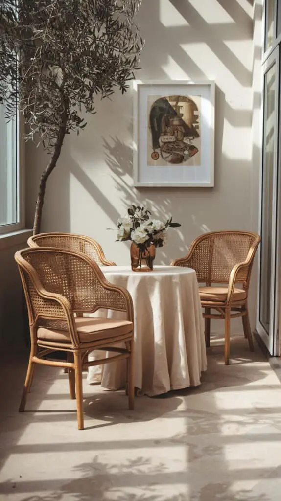 If you’re lucky enough to have a sunroom, turning it into a home café is one of the coziest upgrades you’ll ever make. Think cane chairs, a vintage round table, linen tablecloth, and a coffee bar setup against one wall.