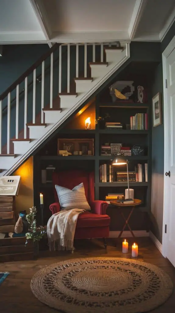 If you’ve got an open area under the staircase, please don’t let it be a junk zone. It’s prime reading nook potential. Even in a small home, this can be such a clever use of space. I’ve seen people paint the inside of the nook in deep moody tones like forest green or aubergine, then add some warm lighting and a vintage armchair and suddenly it’s a whole vibe.