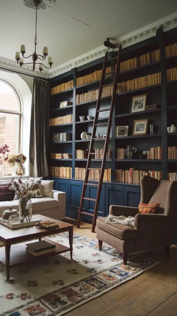 Add a rolling ladder if you’re feeling fancy, but even without it, just the shelves themselves add character. Mix in old picture frames, ceramic pieces, or dried flowers so it doesn’t feel like a bookstore display. Bonus points if there’s a comfy armchair nearby that invites you to linger with a blanket and hot drink. It’s giving English cottage in the best way.