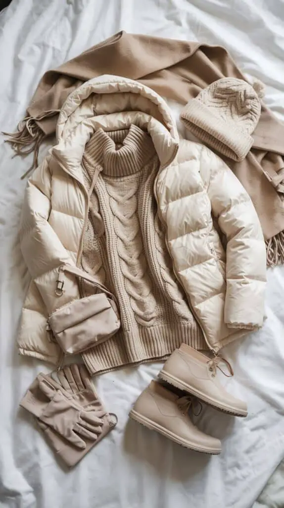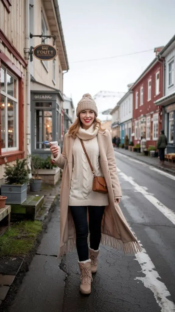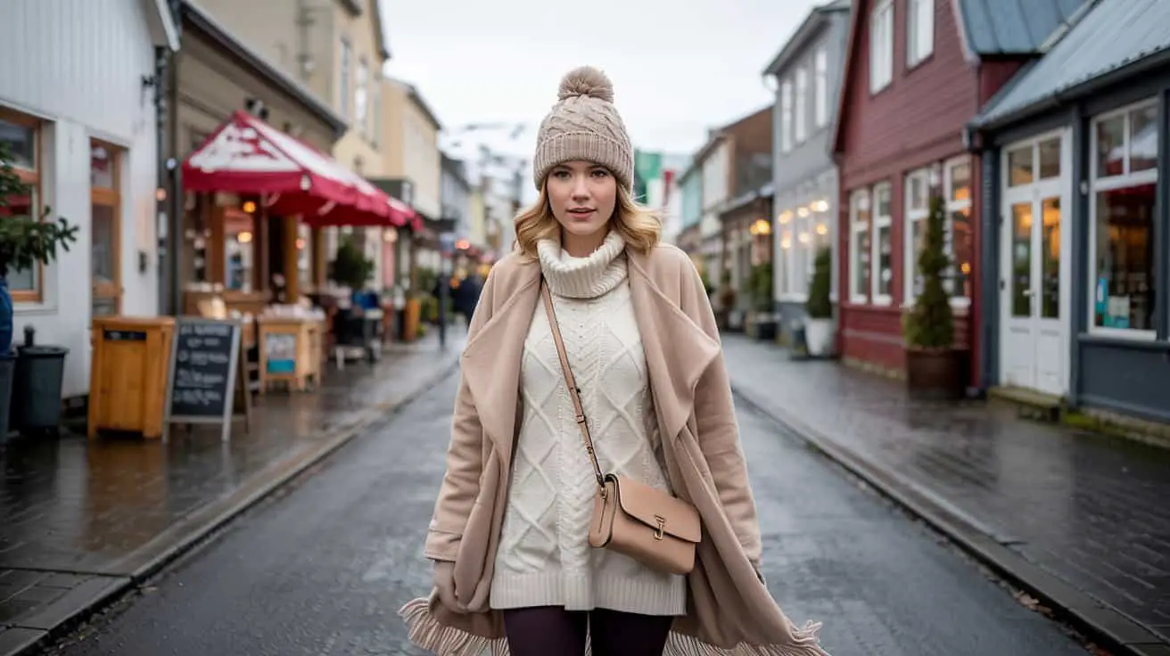 For quiet mornings wandering Iceland’s little towns, soft neutrals always look beautiful against the winter scenery. Think cream knit sweater, beige coat, warm leggings, and a scarf that feels like a blanket. Neutral colors photograph beautifully in snowy light and make you look effortlessly put together.