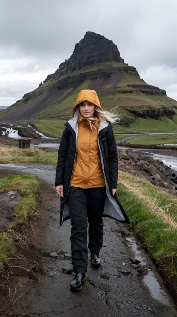 Iceland’s weather loves surprises, so having a waterproof outfit is basically essential. A long waterproof shell over a warm mid-layer keeps you dry without being too heavy. Wear quick-dry leggings or pants and boots that can handle puddles, slush, or whatever the sky decides to drop that hour.