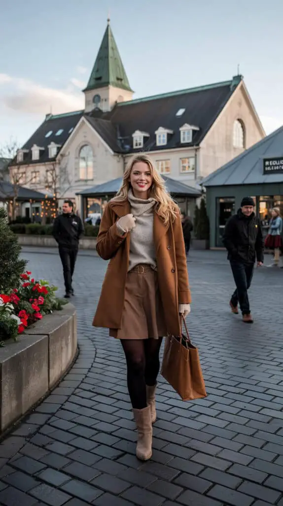 Reykjavík gives you the chance to wear something stylish but still warm. Try a wool coat in a deep color paired with a thick sweater, warm tights, and a skirt or trousers depending on what you prefer. Add a simple scarf, warm gloves, and comfy boots that look a bit dressier. This outfit feels put-together without trying too hard, perfect for Christmas markets, dinner spots, or rooftop views. It’s winter-chic but still cozy enough to handle the cold.