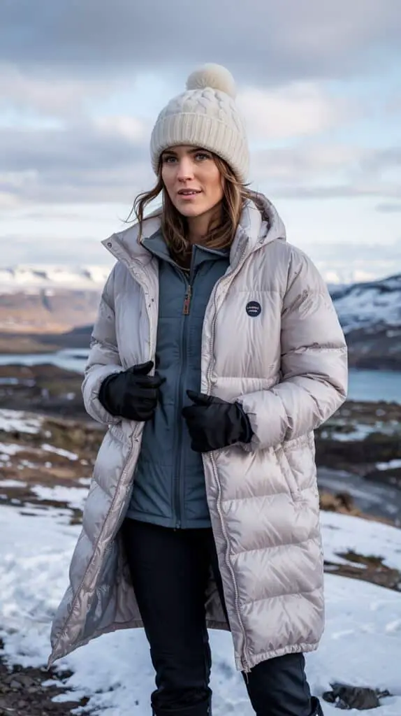 A puffer coat is basically your best friend in Iceland, especially on those days when the cold feels like it’s coming from every direction. Choose one that hits mid-thigh so you get extra warmth without feeling weighed down. Underneath, layer a soft knit and a thermal long sleeve so you can unzip the coat indoors without freezing instantly.