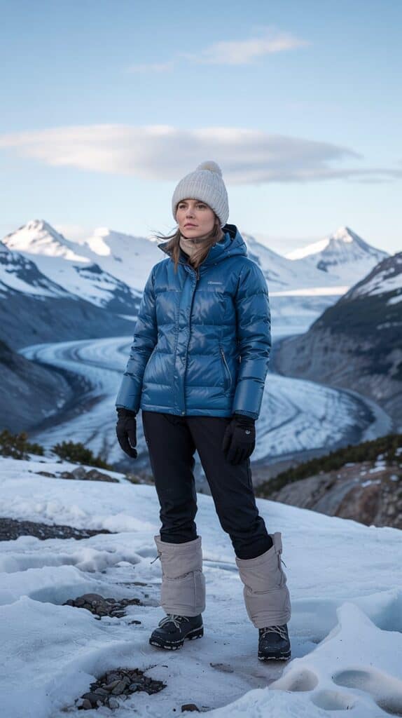 Add a hat that covers your ears and gloves with good grip for holding cameras or phones. Sturdy boots are essential — icy paths are no joke. This outfit is surprisingly cute in photos too, especially against the icy blues and whites of glacier scenery.