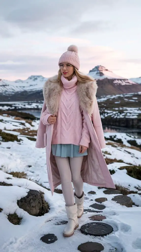Pastels might not be the first thing you think of for Iceland, but they look gorgeous against snowy backgrounds. Try a soft pink or baby-blue sweater with a pale coat, light grey leggings, and white or beige boots.