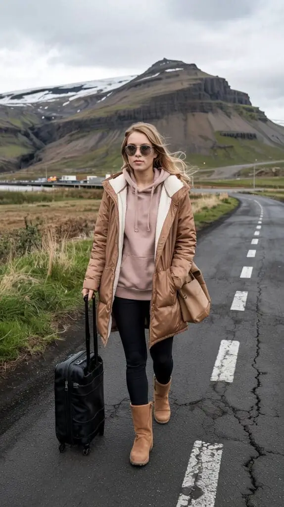 On short trips, your travel-day outfit usually doubles as your first exploring outfit. Choose something comfy but warm enough to step straight into Icelandic weather. A mid-weight coat, stretchy leggings, and a soft hoodie make the perfect combo.