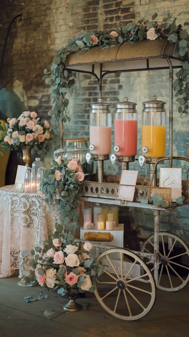 Create a romantic juice bar for weddings using vintage decor like antique carts, lace, and floral arrangements. Glass beverage dispensers and gold-accented signs add elegance, making the setup perfect for special occasions.