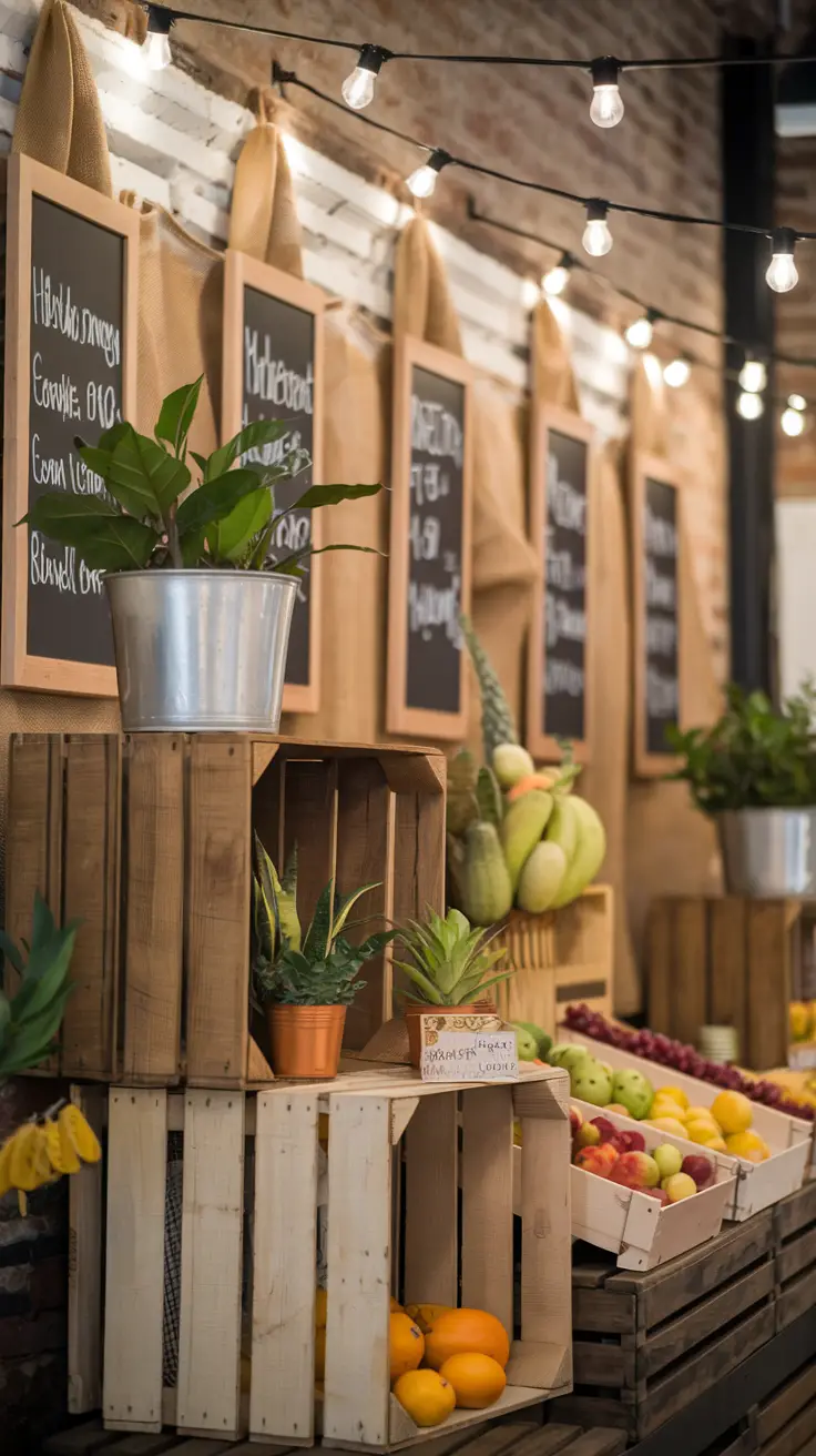 Create a rustic-chic vibe with wooden crates, burlap accents, and potted plants. Use chalkboards for menus and string lights for cozy lighting. This aesthetic is perfect for pop-up stores, blending warmth with charm. Add colorful fruits on display to attract attention.