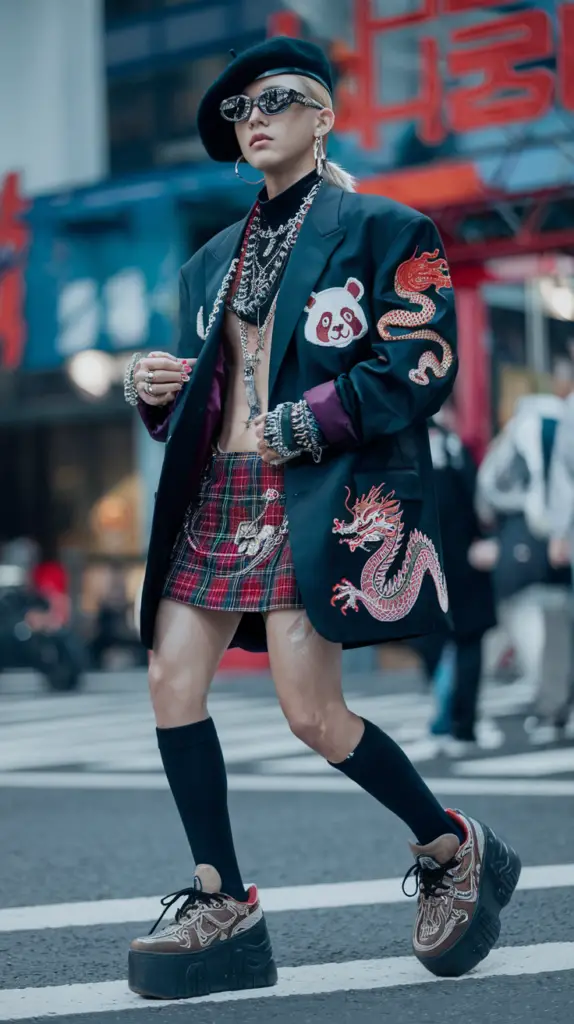Expect to see plaid mini skirts paired with oversized blazers platform sneakers and layered jewelry Think of K-pop fashion outfits but with a Chinese-inspired twist such as red panda motifs or dragon embroidery incorporated into everyday looks