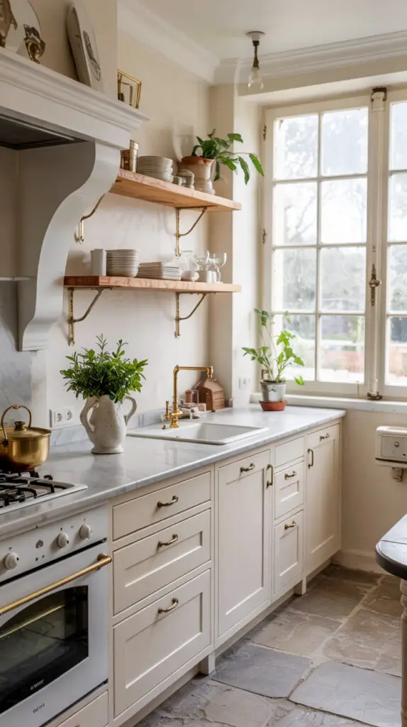 French country kitchens are all about layering textures, and modern ones do it best when they stay understated. Use shaker-style cabinets in soft white, mushroom, or even sage green. Add aged brass hardware, a simple marble backsplash, and open wood shelving that doesn’t look too perfect.