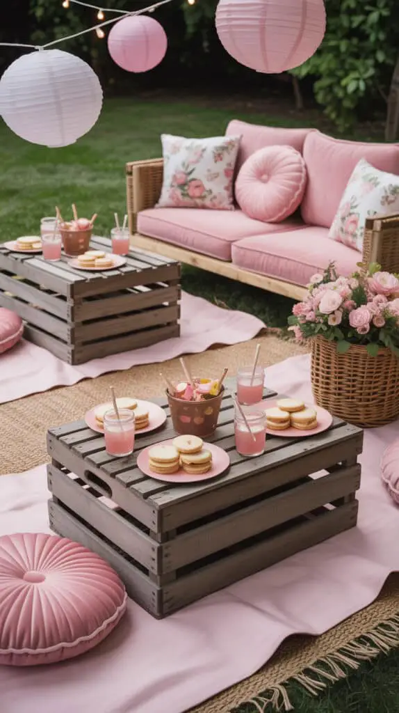 For a laid-back yet utterly adorable vibe, this pink-themed picnic is just the thing. Lay out oversized blankets in soft rose, dusty pink, and ivory. Use low wooden crates or mini tables to serve snacks—finger sandwiches, scones, pink lemonade, and little jars of yogurt parfait. Add some cushions in floral patterns and set everything under fairy lights or paper lanterns if it’s an evening do.