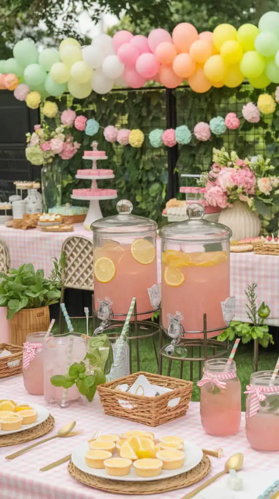This theme is like summer in a glass—bright, refreshing, and full of joy. Start with a base of soft pink and lemon yellow (it sounds bold, but it looks beautiful when balanced right). Set up an actual pink lemonade bar with sliced citrus, glass drink dispensers, striped straws, and a mix-your-own station with herbs like mint and basil. Use gingham tablecloths, woven baskets for snacks, and mason jars with ribbon for drinks.