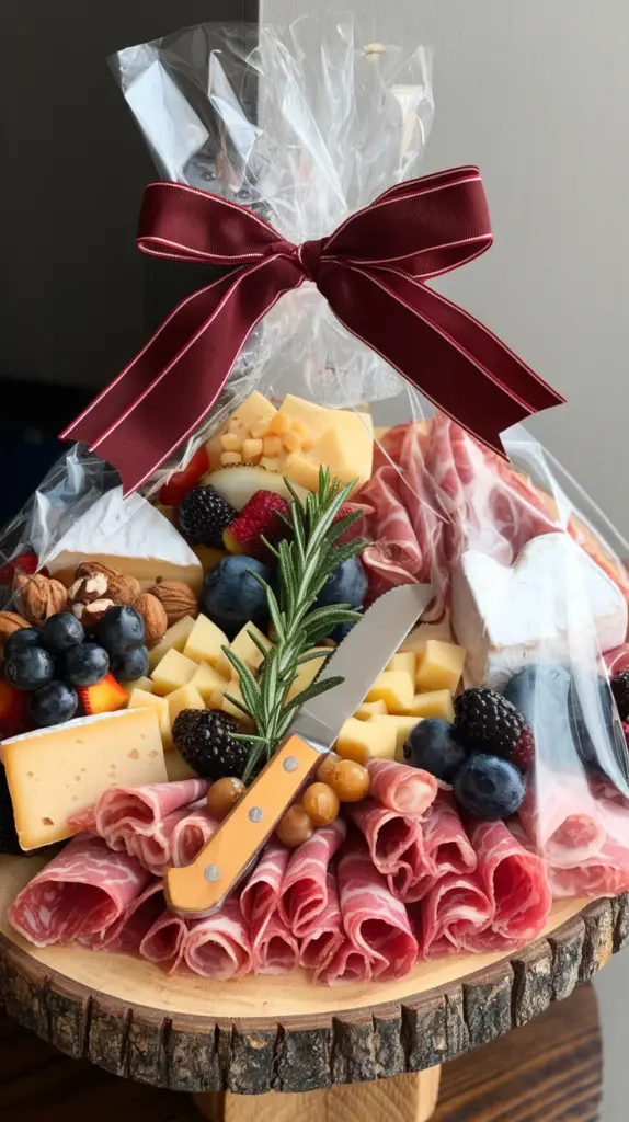 For a charcuterie board, use clear cellophane and tie it with a bold ribbon. Add small extras like a sprig of rosemary or a mini cheese knife to enhance the presentation.